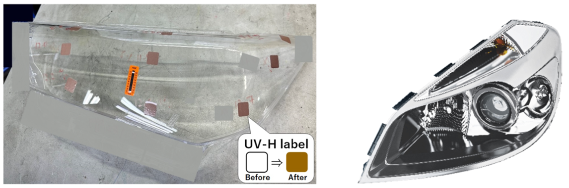 UV irradiation technology is widely used in the automotive industry for many purposes. For example, UV curing of coatings for automobile plastic lenses and adhesives for reflectors greatly contributes to improving productivity and reducing production costs. Our UV labels are used by many automobile related customers to confirm their mass production process of UV irradiation and for periodic inspections.